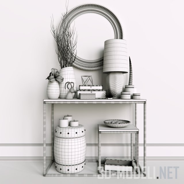 Набор декора, мебели и аксессуаров в современный интерьер гостиной. Основа композиции - консоль и табурет из серой плиты на графитовых металлических каркасах. Над консолью - круглое зеркало в графитово-серебристой багетной раме. Под консолью - декоративная тумба в виде серебристой бочки. На тумбе - три толстые серебристо-серые свечи. На консоли: светильник с черным тканевым абажуром, шкатулки из сине-зеленого стекла и отделанные черно-серым текстилем, пара ваз с сухими ветками и цветами и блюдо из такого же материала, что и вазы, композиции из тонких палочек. Притягивает внимание деревянный бюстик, изображающий горного козла.