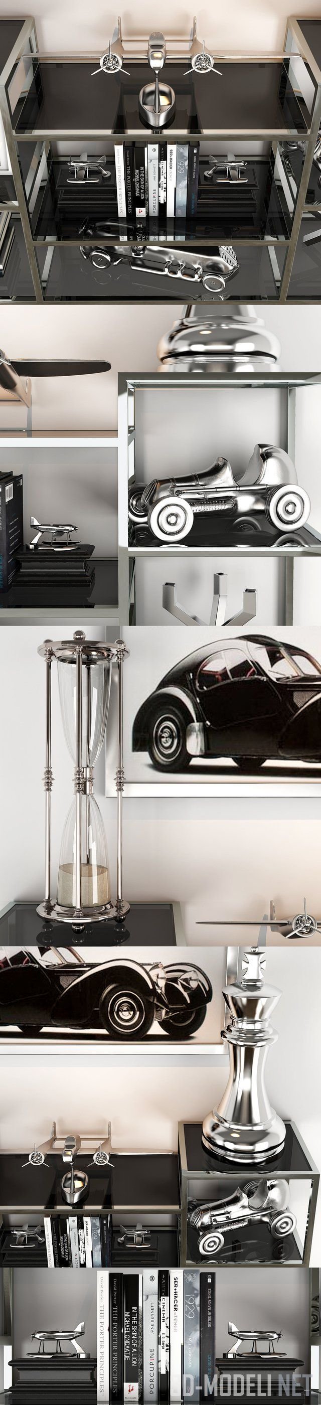 Небольшая коллекция аксессуаров и сувениров от Eichholtz Accessories в виде ретро-техники серебристых цветов. На стеллаже Smythson (160x38x75см), сваренном из квадратной хромированной профильной трубы разместились: высокие песочные часы (21x21x65см), фигурка двухмоторного самолета Fokker dixieland (60x36x23см) и маленьких гидропланов (14x18x16см), большая шахматная фигура короля (29x29x68см), ретро-автомобили, хромированный тройной подсвечник Mykonos (27x27x24см), книги, черно-белое фото в рамке. На стене - черно-белый постер (110x67см) с изображением ретро-автомобиля с рекламным слоганом, в хромированной рамке.