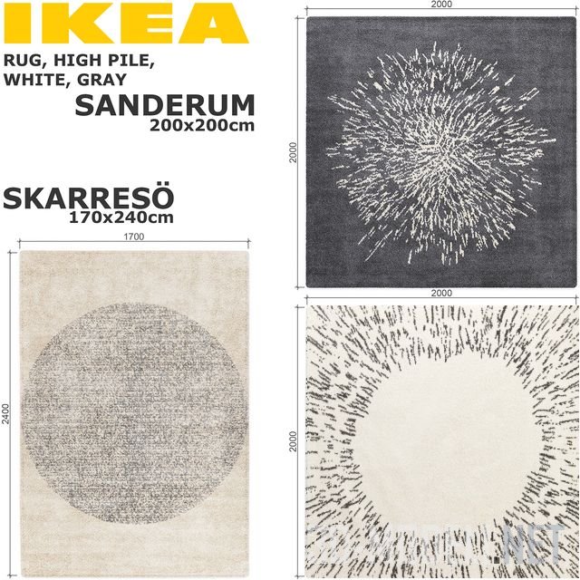 Небольшая коллекция длинноворсовых ковров SANDERUM, SKARRESO (SANDERUM, SKARRESЁ) от IKEA. Квадратные (200х200см) и прямоугольные (240х170см) ковры с лаконичным геометрическим рисунком в теплом белом и бледно-темно-сером тонах хорошо подходят для современного пространства.