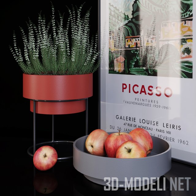 Красивый декоративный набор с картинкой-плакатом Picasso. На переднем плане стоит круглое блюдо серого цвета с крупными аппетитными красными яблоками. На круглой металлической подставке - терракотовое кашпо с зеленым вереском.