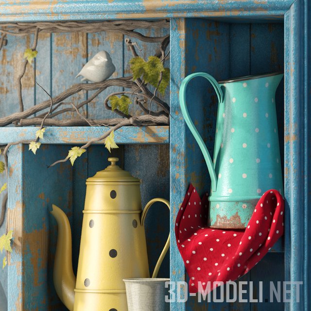 Декоративная композиция в рустикальной синей деревянной рамке с винтажными вещами «с чердака». Пространство рамки деревянными досками разделено на пять ячеек, в которых размещены: вьющаяся виноградная лоза, керосиновая лампа с медным корпусом, несколько керамических белых птичек, жестяной желтый кофейник в коричневых горохах, керамический стакан, два металлических графина разного цвета и размера, красная с белым горошком салфетка. Задний план композиции набран рустикальными досточками в цвет рамки.