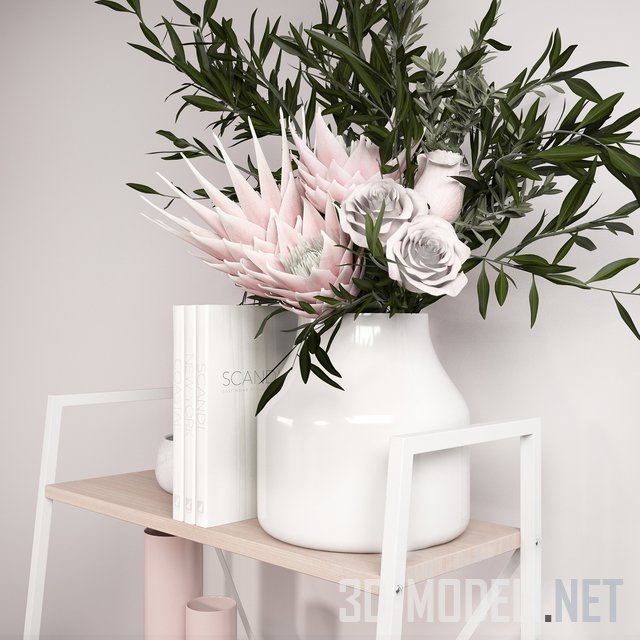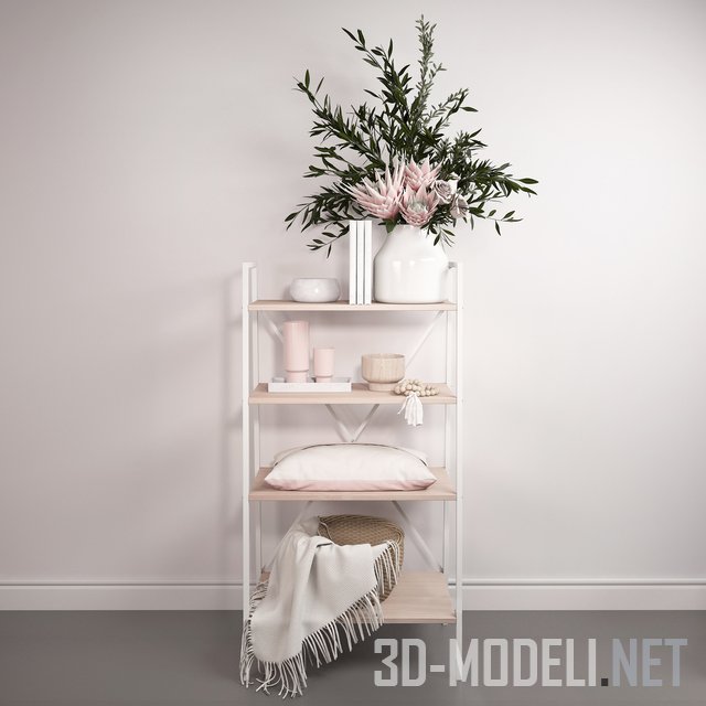 Небольшой белый стеллаж из металлической трубы квадратного сечения с деревянными полками и аксессуарами в скандинавском стиле. Предметы подобраны в нежных розоватых тонах. На верхней полке: крупная белая ваза с ветками эвкалипта и розовыми цветами, книги в белых обложках, керамическая белая миска. На нижней полке: плетеная корзина с белым пледом. На остальных полках: подушка, деревянные бусы и чашка из дерева, розовые вазочки, белый поднос.