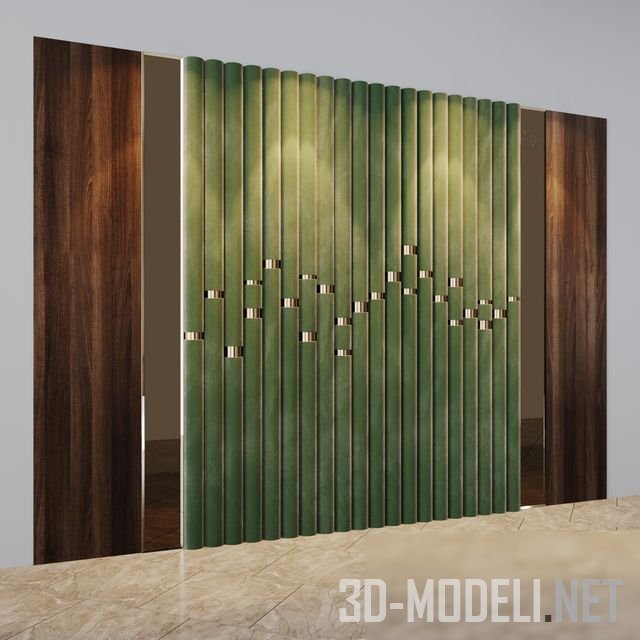 Декоративная стеновая панель, хороший вариант для оформления изголовья кровати. Панель выполнена в сочетании деревянных элементов и центральной мягкой, тканевой части. Она напоминает бамбук, что послужит интересным намеком в интерьере.