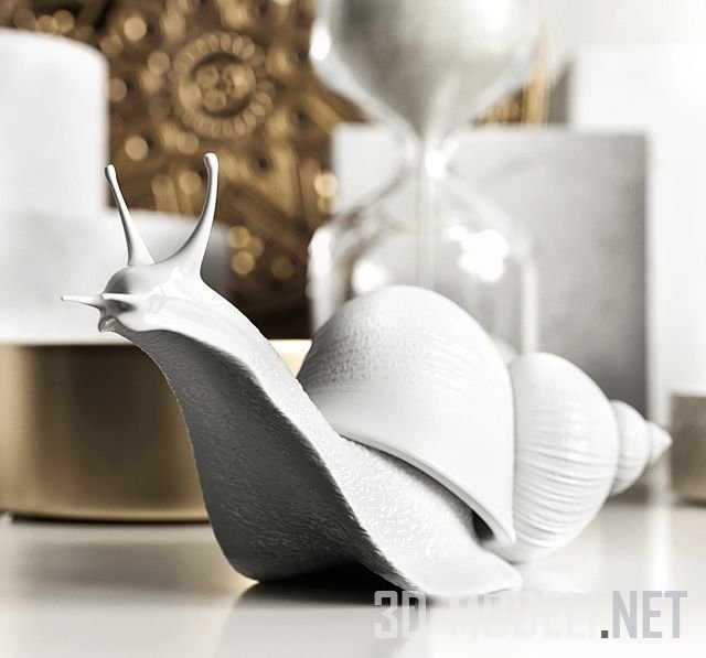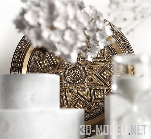 Собранные в гармоничную группу преимущественно белого цвета декоративные аксессуары. Подсвечники и вазы, цветы гипсофилы и гортензии, статуэтки и песочные часы воплощают нежность. Чеканная тарелка, золотая улитка и подсвечник вносят красивый контраст и тепло.