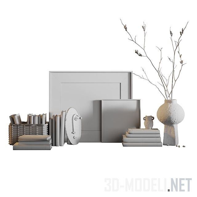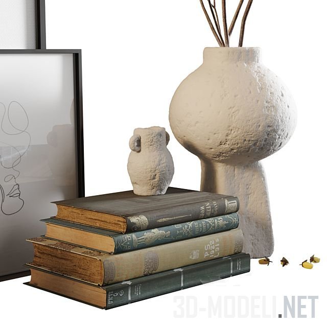 Небольшой комплект предметов для декорирования интерьера. Набор с налетом старины, благодаря книгам в соответствующих переплетах и вазам с рустикальной поверхностью. В одной из ваз ветка с ягодами. Также присутствуют постеры в рамках и скульптура-лицо.