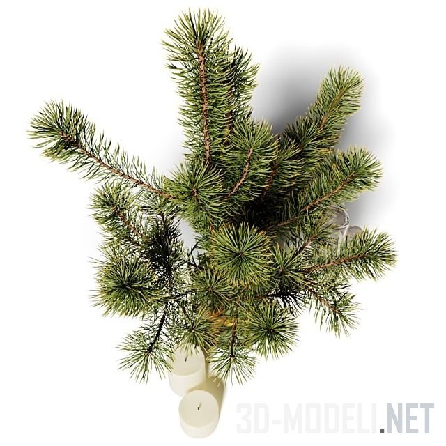 Небольшой набор интерьерного декора с букетом сосновых веток в цилиндрической вазе из прозрачного стекла. Дополняют вазу толстые белые свечи и пара стеклянных песочных часов с белым порошком внутри.