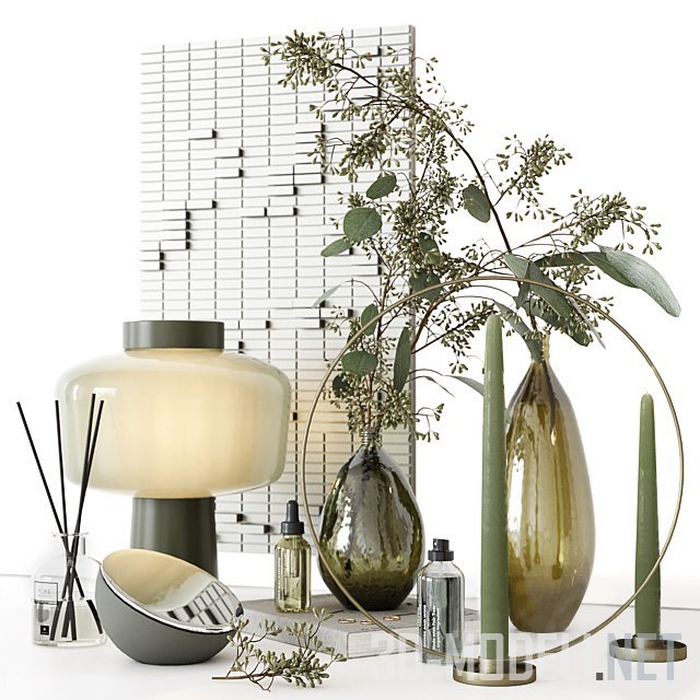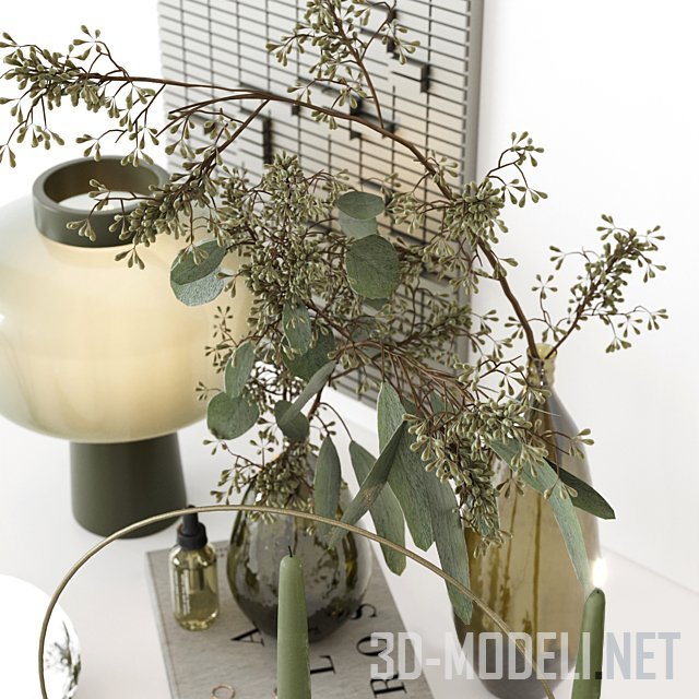 Для украшения современного пространства хорошо подойдет набор декоративных аксессуаров. Сет содержит вазы с ветками эвкалипта, зеленого цвета свечи, ароматические масла, книги, настольное зеркало. Настольная лампа с массивной ногой и белым стеклянным плафоном удачно дополняет набор.