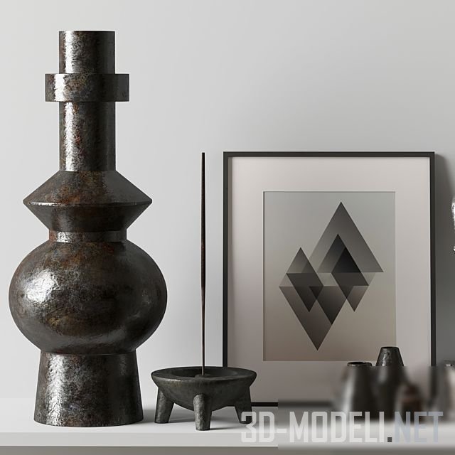 Белые полки с интерьерным декором - керамическими изделиями, абстрактной графикой в черных фоторамках, книгами, настольным зеркалом в хромированной рамке и светильником LOLLIPOP от Hanna Sarokaari. Настольная лампа выполнена в виде небольшого белого цилиндра с шариком лампы и белого круглого плоского рефлектора с вертикальным переломом за лампой. Все элементы - в спокойных нейтральных тонах.