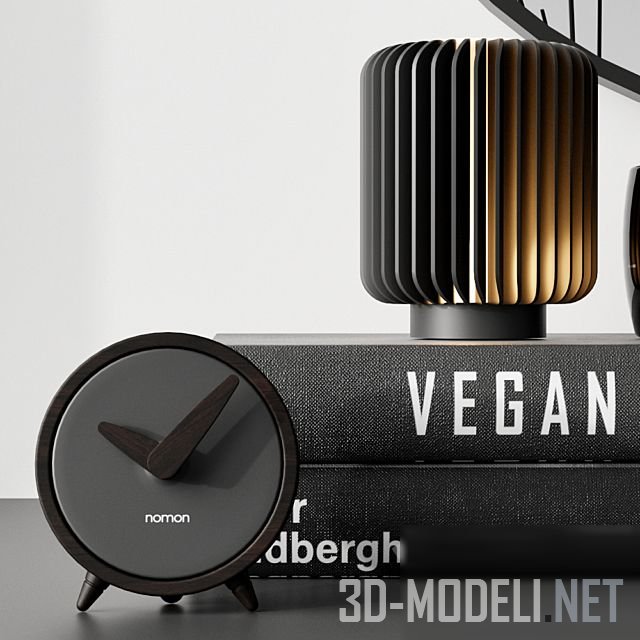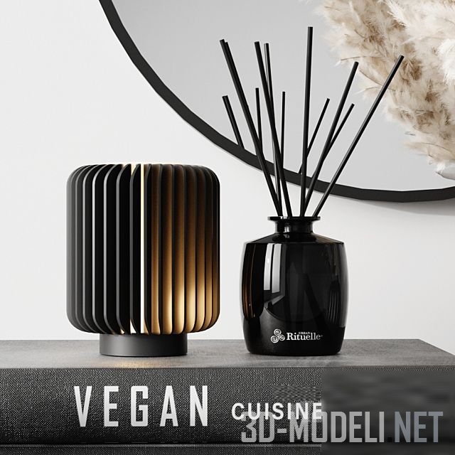 Интересный набор аксессуаров для современного интерьера. В невысокой черной вазе стоят пушистые белые метелки сухоцвета. На стене круглое зеркало в тонкой черной раме, в наборе книги VEGAN. На книгах стоит черная глянцевая емкость Rituelle с ароматическими свечами. Небольшие круглые часы nomon черного цвета, очки и белая вазочка дополняет сет.