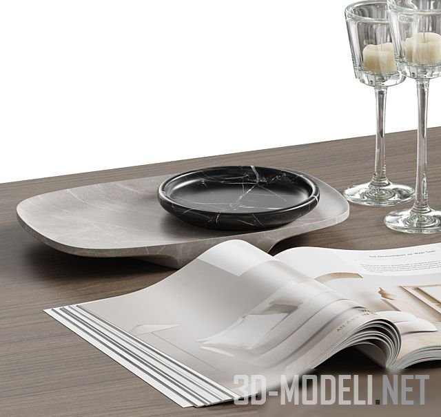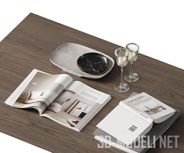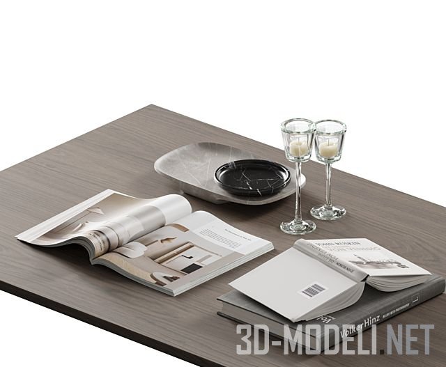 Гармонично подобранные интерьерные аксессуары для заполнения поверхности журнального стола. Книги и журналы, плоские блюда (вазы) для фруктов или выпечки, а также свечи в подсвечниках-бокалах из прозрачного стекла.