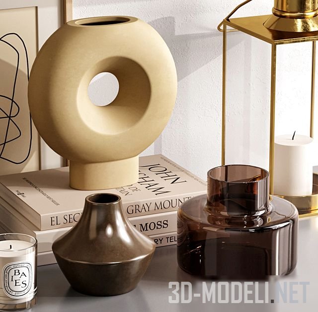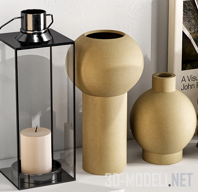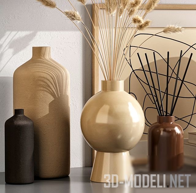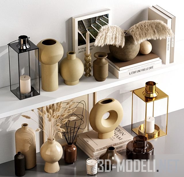 Традиционный для подобной комбинации аксессуаров сет, с засушенными цветами, вазами и картинами. Вазы присутствуют глянцевые керамические и деревянные, также на полке есть книги, статуэтки и свечи.