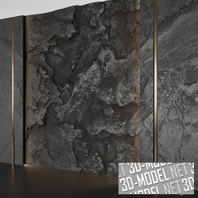 Современный стеновой декор в виде рельефной поверхности, имитирующей текстуру черно-серого камня. Плоскость стены разбита на три зоны: центральная плоскость второго плана с более выраженным рельефом камня и две выступающие панели по бокам, с плоской серебристо-серой поверхностью и черными прожилками. Две вертикальные золотистые канавки на боковых плоскостях и скрытая подсветка справа и слева от центральной панели - добавляют декоративный эффект и создают игру свето-тени на рельефе камня. Габарит панели: 3х5м.