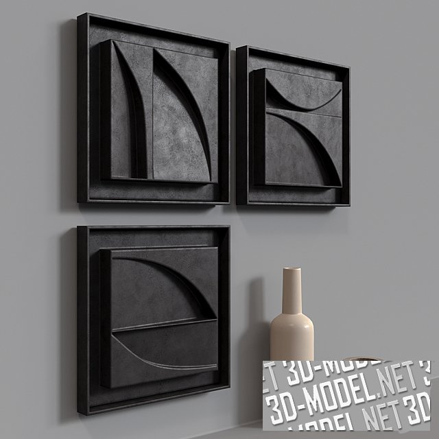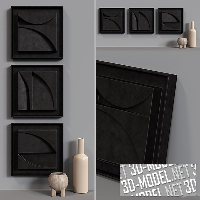 Три квадратные, декоративные стеновые 3D-панели с абстрактным рисунком в тонких рамках. Панели -черно-коричневого цвета. Габарит каждой: 28х28см. Композиция на стене дополнена керамической бутылкой бежевого цвета и небольшой деревянной вазой в виде срезанного шара на четырех ножках.
