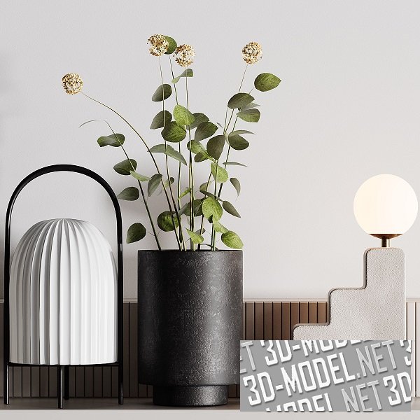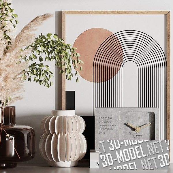 Современный набор интерьерного декора для различных поверхностей. В наборе присутствуют традиционные для набора элементы: вазы, книги, ароматы для дома, зеленые растения и букет пампасной травы, абстрактное панно и др.