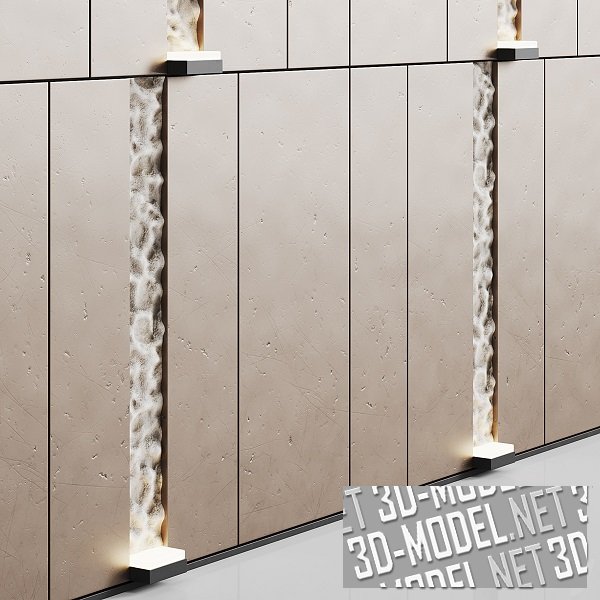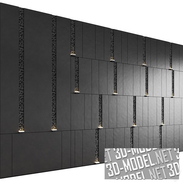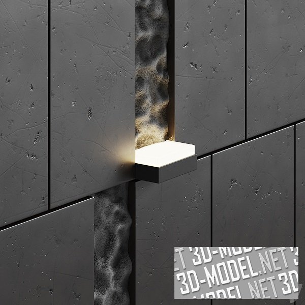 Два варианта (в черном и коричневом цвете) декора стены. Отделка стены выполнена из панелей двух видов. Одни (фоновые)- из металла, плоские, гладкие с небольшими царапинами и раковинами. Другие (в качестве вставок, шириной 10см) - рельефные, с поверхностью старого, сглаженного прибоем, рифового камня. В нижней части этих вставок - встроенный небольшой фасадный светильник с квадратным корпусом. Светильник подчеркивает рельеф каменной вставки. Габарит стены: 550х340х7,5см.