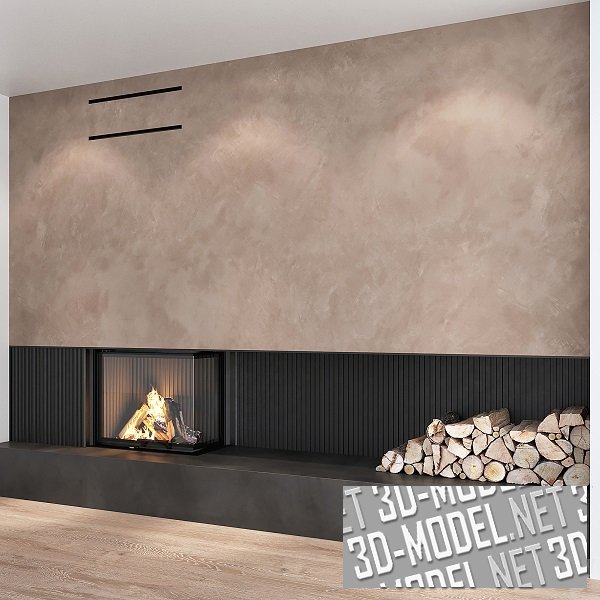 Современная стена с камином и дровами, с отделкой в четырех вариантах. Каминные топки Romotop IMPRESSION в трех типоразмерах, установлены над подиумом. Отделки стены со встроенным дымоходом следующие: светло-коричневая декоративная штукатурка; вертикальные фрезерованные рейки из светлого дерева; прямоугольные темно-серые плиты разного размера; комбинация гладкого светло-серого бетона и панелей из бежевого дерева. Фрагмент стены второго плана, на высоту топки камина отделана узкими черными рельефными панелями. В каждом варианте дровницы обустроены по разному: дрова на подиуме, в длинной нише под подиумом, в короткой нише в подиуме справа от топки. Габариты стены с камином: 350х250х850см.