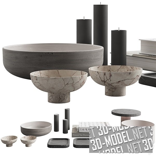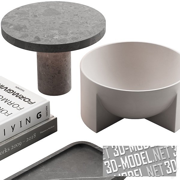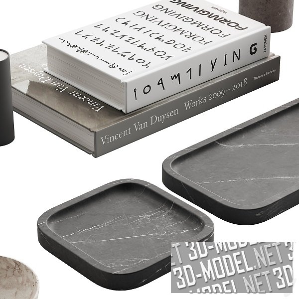 Коллекция современного интерьерного декора NEUTRAL от Formliving. В наборе: пара книг в твердых обложках, подносы из черного мрамора, пиалы на ножках из бежевого мрамора, миска из серого камня, круглый вазон бежевого цвета, круглая подставка из гранита двух цветов и три белые свечи в разновысокий черных цилиндрах.