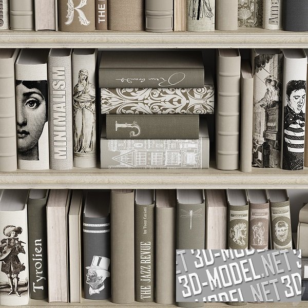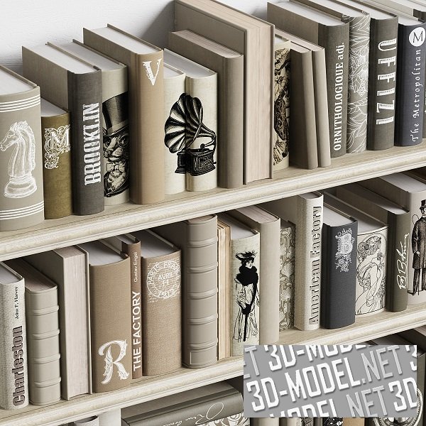 Небольшая библиотека классической литературы на четырех книжных полках. Кромки полок декорированы классическим молдингом. На корешках книг - графика и названия на английском языке. Цветовая гамма подобрана очень гармонично. Переплеты и обложки - в спокойных бледных оттенках песочного, оливкового, бежевого, светло-серого.