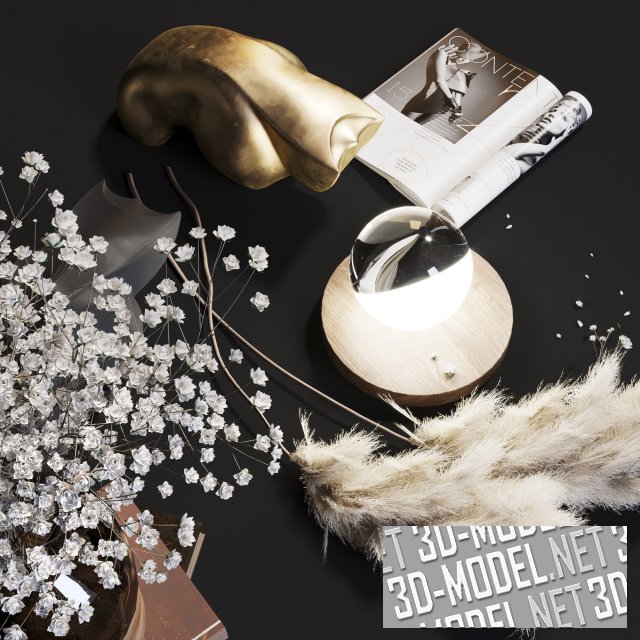 В наборе гармонично собраны и другие элементы. Это книги, журналы, сухой букет в вазе и пр.