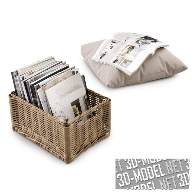 Плетеная корзина с глянцевыми журналами, большая серая подушка с лежащим на ней открытым журналом - эти предметы вполне подойдут как дополнительные элементы декора пола в интерьере комнаты.