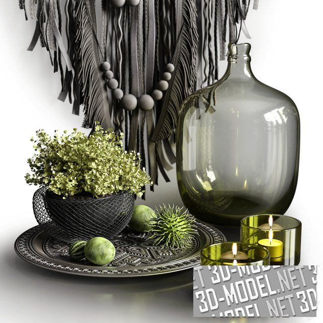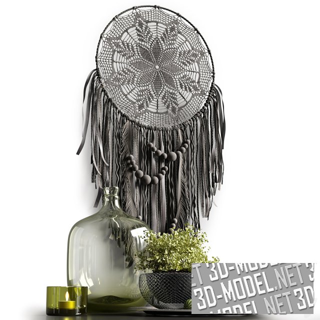 Декоративная интерьерная композиция с серым «ловцом снов» в технике макраме, в центре. Обруч заполнен цветочными кружевами. Снизу - длинная серая бахрома из кожаных ремешков и серые бусы. На переднем плане композиции - стеклянная дымчатая бутыль, черно-серая ваза, выточенная из древесного корня, с пышным букетом из мелких цветов салатового цвета, круглый металлический поднос с рельефным орнаментом, сетчатое металлическое кашпо с мелколистным зеленолиственным растением, черная металлическая статуэтка в виде двух тонких стоящих абстрактных фигур и нескольких невысоких стаканов из желто-зеленого бутылочного стекла с чайными свечами. Несколько мелких экзотических плодов зеленого цвета на круглом подносе добавляют натюрморту цвета и жизни.