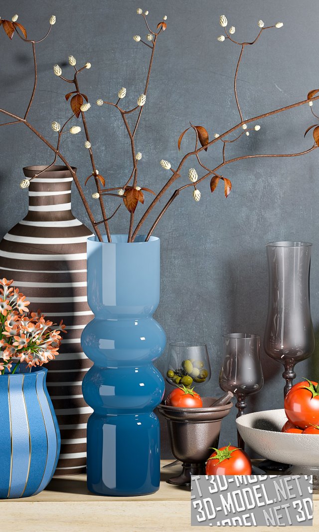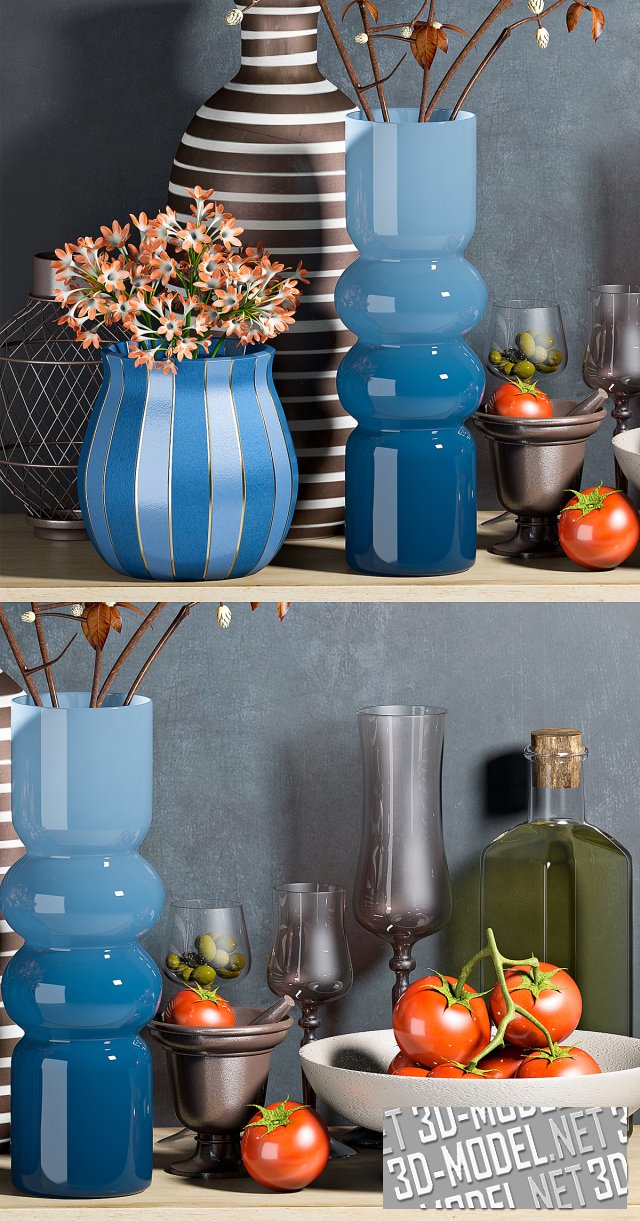 Композиция из элементов интерьерного декора с томатами на блюде, оливковым маслом в стеклянной бутылке, бокалами из дымчатого стекла, коричневой ступкой с пестиком, подсвечником-«фонариком» из металлической проволоки и трех ваз. Самая высокая, с узким горлышком - в горизонтальную, белую и коричневую полоску. Вторая, низкая (в вертикальную светло-голубую и голубую полоски, разделенные тонкой золотистой полоской) - букет мелких, оранжево-белых цветов. В третьей, средней вазе цвета арктического льда (плавная растяжка от светло-синего вверху, до синего внизу) - ветки с мелкими белыми шишечками. В одном из бокалов - зеленые оливки.