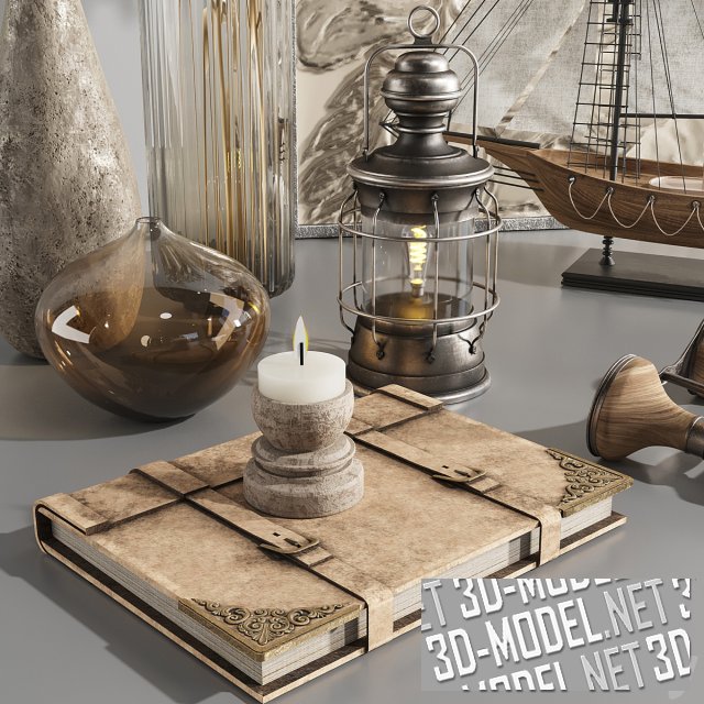 Интерьерный декор в композиции с нотками морских путешествий в бежевых тонах. Изюминка набора - настольная модель деревянного двухмачтового парусника, деревянный бинокль, ретро-фонарь в металлическом корпусе, органайзер с ременными застежками в кожаной обложке бежевого цвета, круглый бригет на цепочке. Элементы навевают мечты о морских романтических приключениях и открытиях. Свеча на керамическом подсвечнике, вазы разного размера (в одной из них - букет сухих растений) и квадратное панно с барельефом, изображающим крупный цветок, в тонкой серебристой рамке - дополняют композицию.