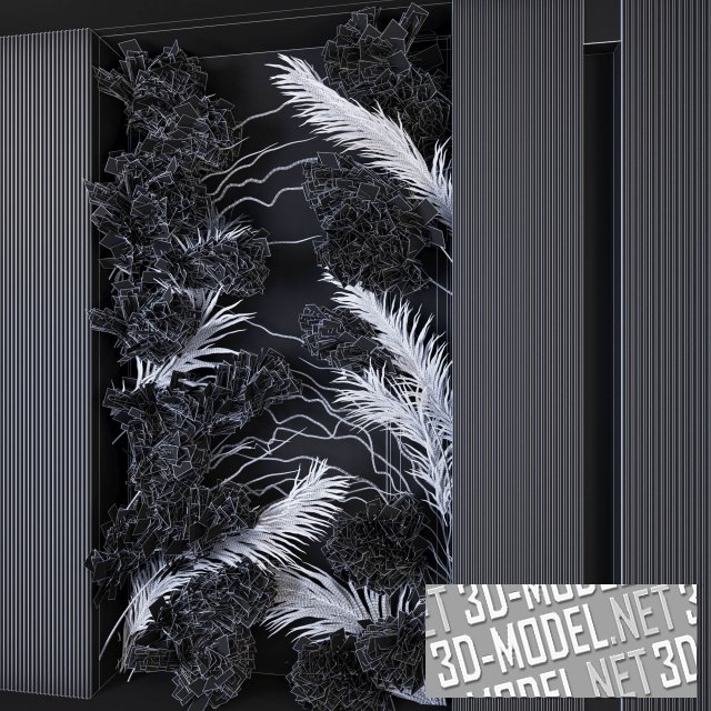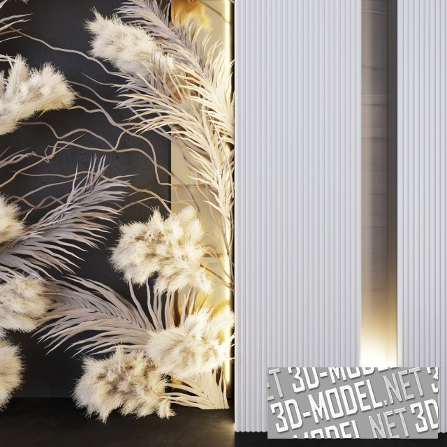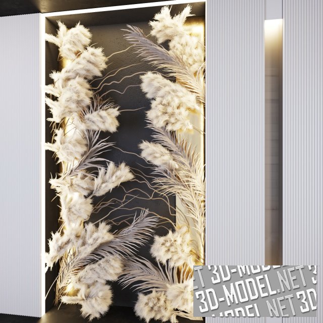 Черно-белая современная декоративная стена Organic, с крупными пушистыми метелками сухой пампасной травы и извилистых веток в центральной части с черной нишей. По бокам от ниши стена декорирована белыми гофрированными панелями с вертикальной фрезеровкой и подсветками во вставках. Центральная ниша тоже подсвечена, что выгодно подчеркивает природные материалы декора.