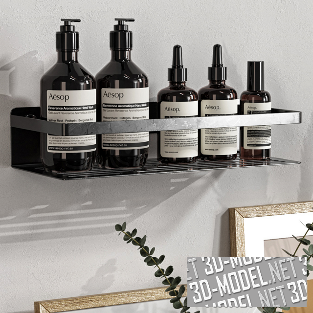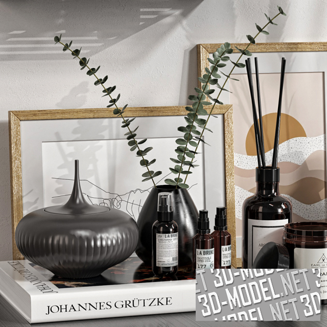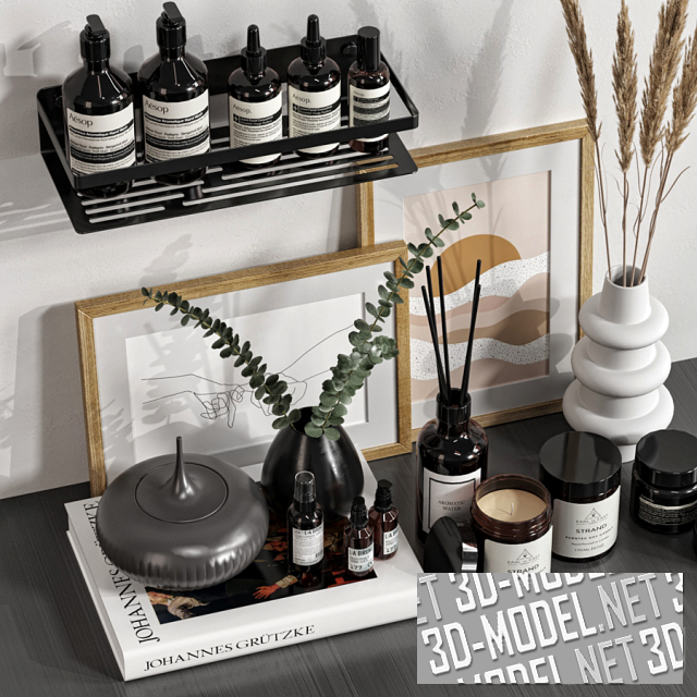 Баночки и пузырьки из темно-коричневого стекла с косметическими средствами, вазы с веточками эвкалипта и с сухими метелками злаков, книга, деревянные фоторамки с графическими работами. Несколько пузырьков расположились на небольшой черной полке с бортиком, закрепленной на стене над основной композицией.