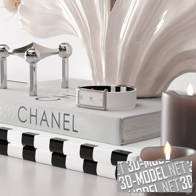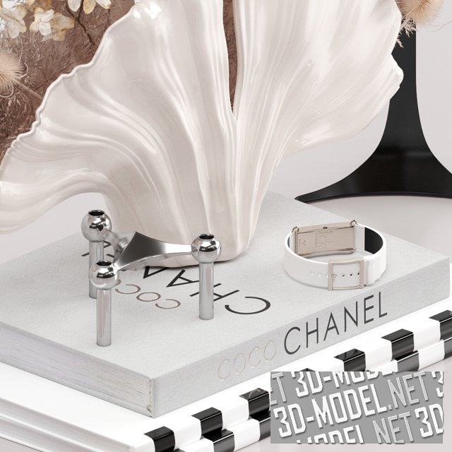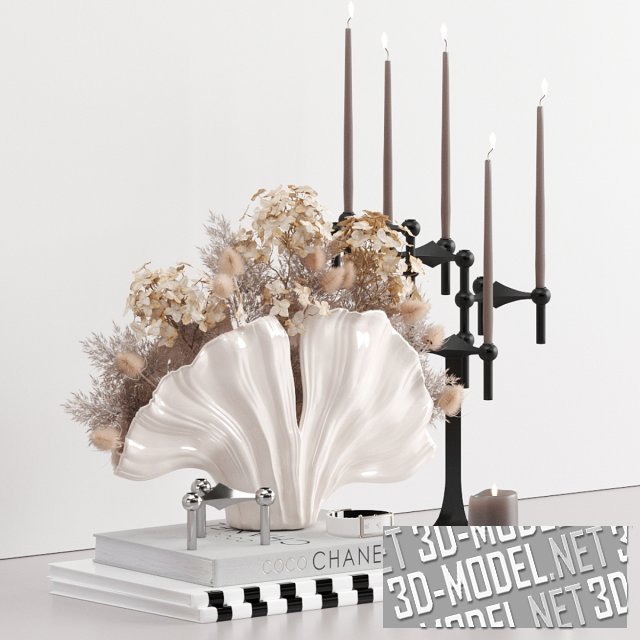 Интерьерная декоративная композиция с черно-серым подсвечником (STOFF Nagel) на пять свечей, белой керамической вазой в виде стилизованного листа гинкго билоба с букетом из сухих цветов и злаков, белыми женскими часиками Citified от Calvin Klein, пары крупных свечей нюдово-серого оттенка, небольшой сувенирной хромированной статуэткой и трех книг.