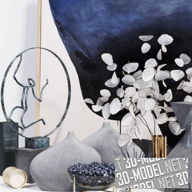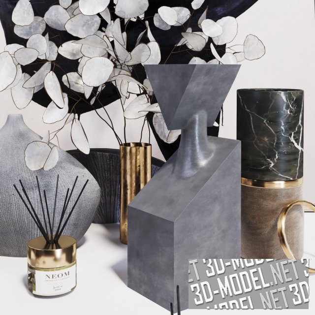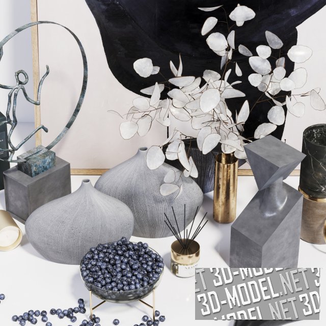 Качественный набор аксессуаров для украшения интерьера. В комплекте гармонично собраны такие предметы, как птичка, вазы hpdecor, фигурки и другие элементы декора. Реалистичная 3d-модель с настроенными материалами и текстурами в архиве.
