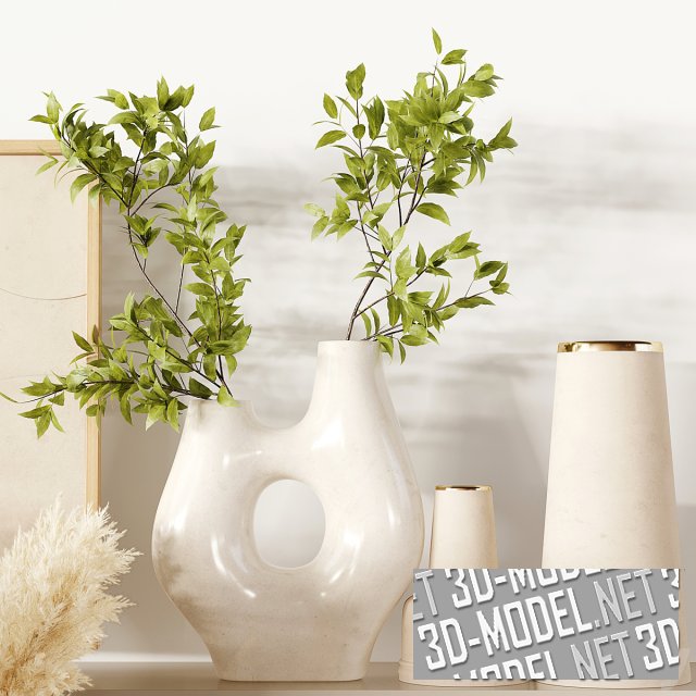 Очень эстетичный сет в бело-зеленом сочетании цветов. На полках стоит множество ваз различных форм и размеров: стеклянных и керамических цвета слоновой кости, белого и в черную полоску. В некоторых вазах стоят ветки белой пампасной травы, зеленые листья спиреи, эвкалипта и других растений. Забавные фигурки, круглые часы-будильник и белая настольная лампа дополняют инсталляцию.