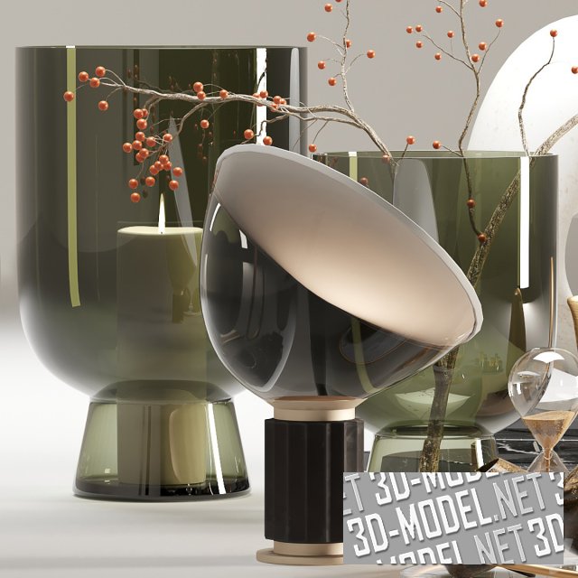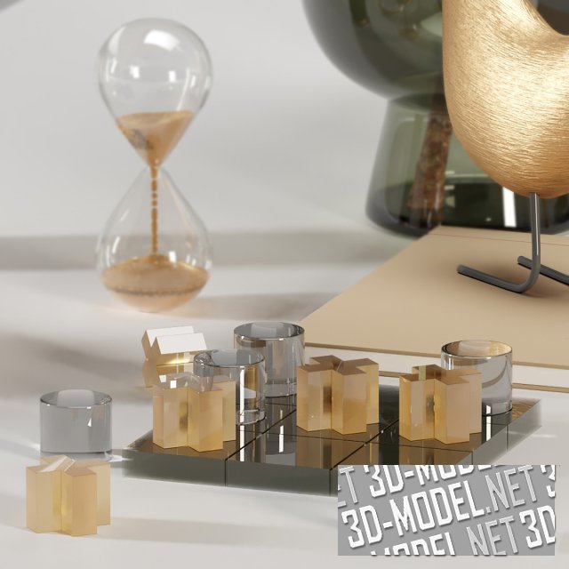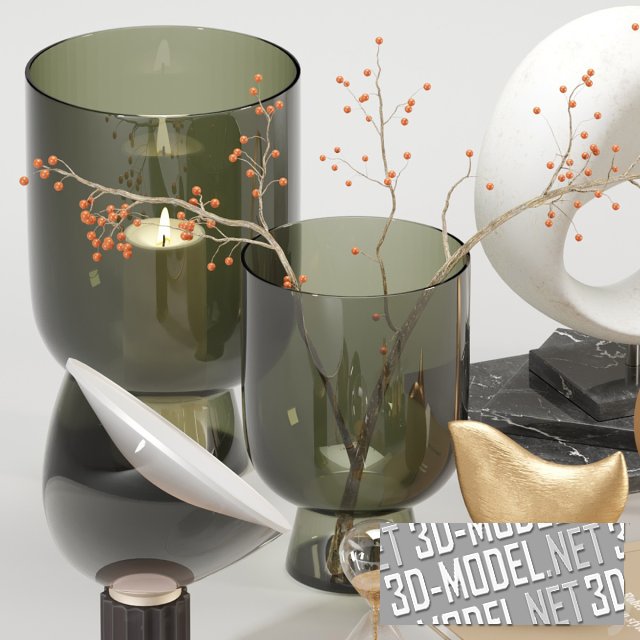 Красивый декоративный сет для современного интерьера: две большие вазы из зеленого стекла, В одной из ваз стоит большая светлая ветка с оранжевыми ягодами; белое объемное кольцо неправильной формы, стоящее на подставке из темного мрамора; стилизованная фигурка птицы, покрытая золотистым брашированным металлом, широкая книга в светло-бежевом переплете и игра «Крестики-нолики» со стеклянной доской и стеклянными дымчатыми ноликами и стеклянными крестиками золотистого цвета.