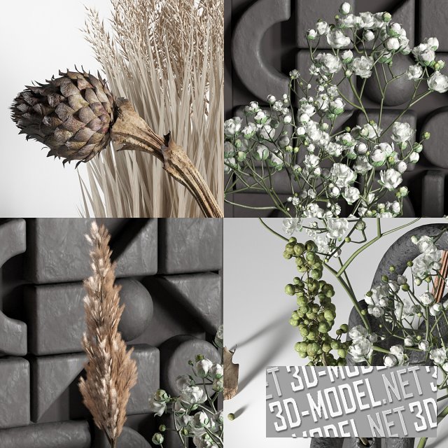 Декоративная композиция с серыми элементами, сухими травами и гипсофилой. Фоном для группы предметов декора служит прямоугольное темно-серое панно с рельефным пиктографичным изображением. В абстрактный серый вазон из трех разновысоких арок на кольце помещена ветка белой гипсофилы, сухой чертополох и колосок сухого злака. На сером кубе подставки смонтирована копия скульптуры Игоря Миторая «Centurion». Небольшая настольная лампа Artemide Dioscuri с белым шарообразным плафоном и изящная стеклянная ваза с тонкими сухими злаками разбавляют брутальность вышеперечисленных элементов композиции.