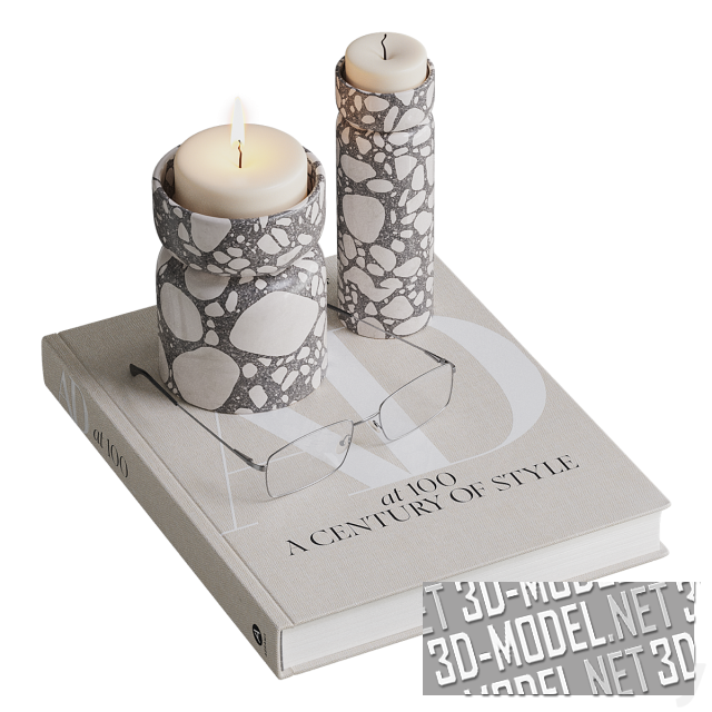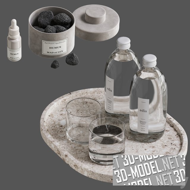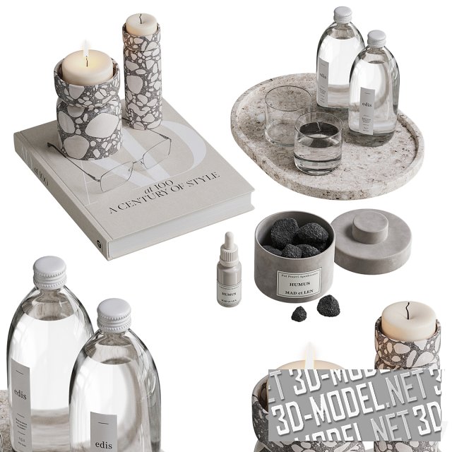 Современный набор аксессуаров для интерьера помещения. Выполнен в скандинавском стиле. В данный комплект входят стаканы, поднос, книга, вода Edis и подсвечники от производителя West Elm.