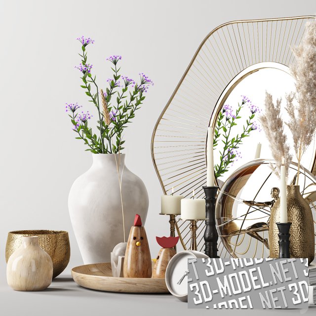 Современный набор декора для украшения и дополнения интерьера комнаты. Букеты цветов и пампасной травы в белой и позолоченной вазах, зеркало, свечи в подсвечниках, деревянные фигурки петуха и курицы и скульптура человека объединены в цельную декоративную композицию.