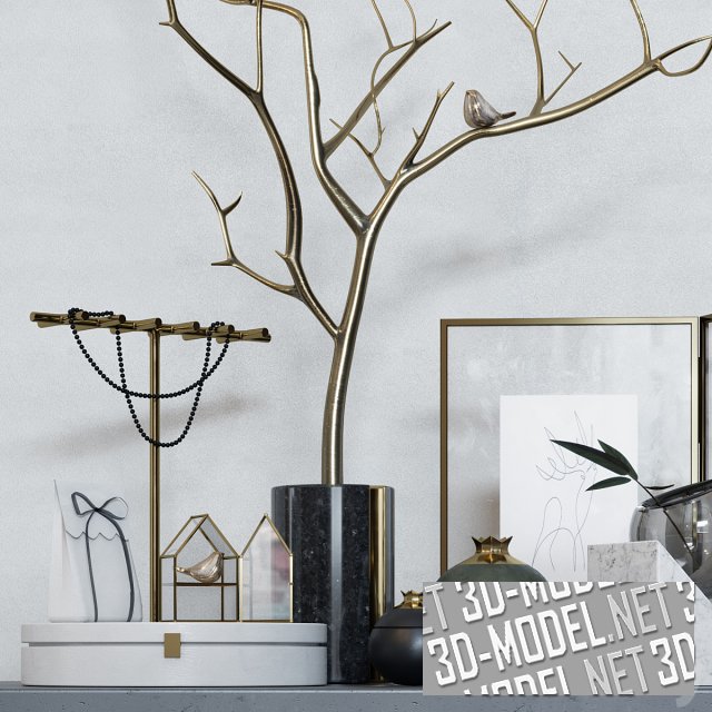 Набор декоративных аксессуаров, которые образуют привлекательную композиицию для реалистичного наполнения в современном дизайне интерьера. Узкие и длинные подсвечники с позолотой, горящие свечи, искусственные позолоченные ветки с птицей и другие элементы смотрятся цельно и гармонично.