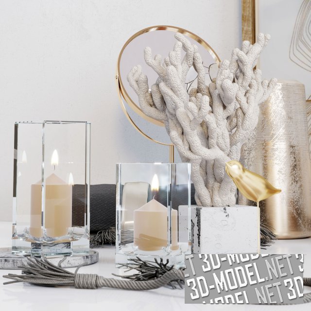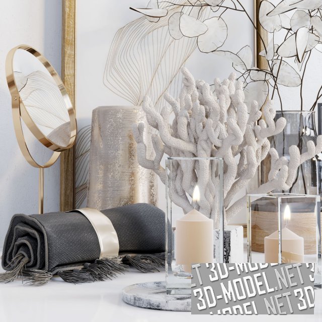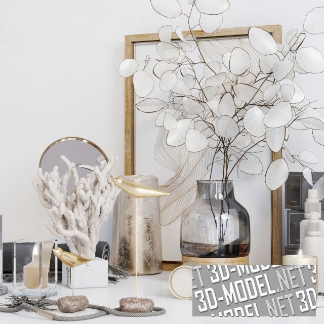Интерьерный набор декора, состоящий из свечей, картины в рамке, небольшого круглого зеркала, веток Лунарии в стеклянной вазе и других декоративных элементов. Эта гармоничная композиция послужит реалистичным наполнением современного дизайна интерьера.