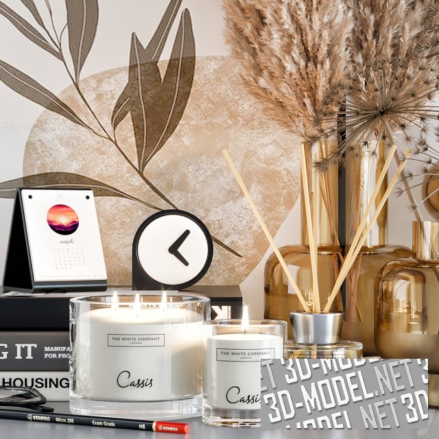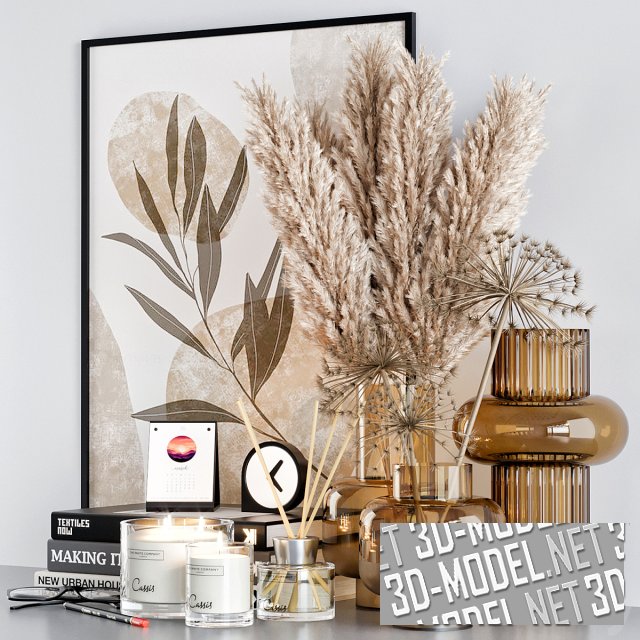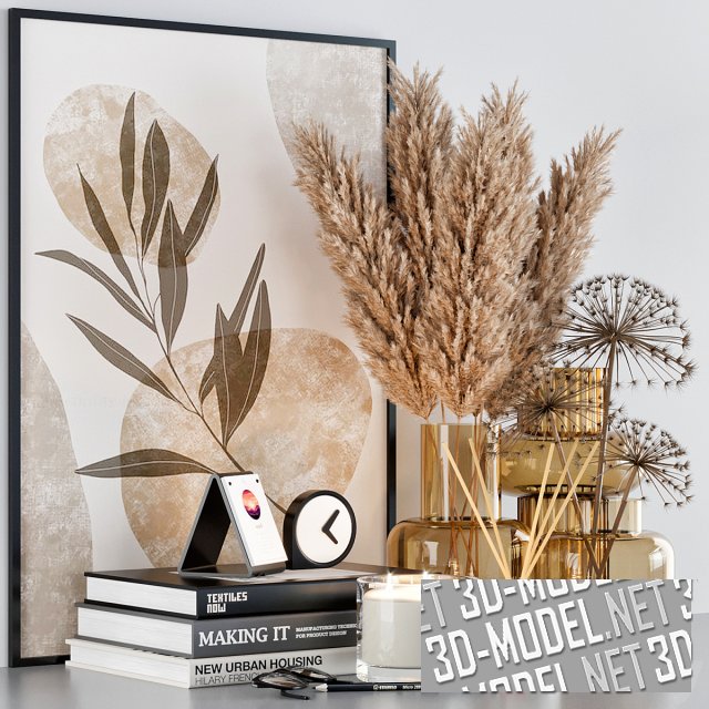 Интересный набор декора для современного интерьера. Состоит из сухоцветов и пампасной травы в вазах, картин, подсвечников, часов, книг, карандаша и очков. Эта целостная гармоничная композиция послужит отличным декоративным наполнением в интерьере.