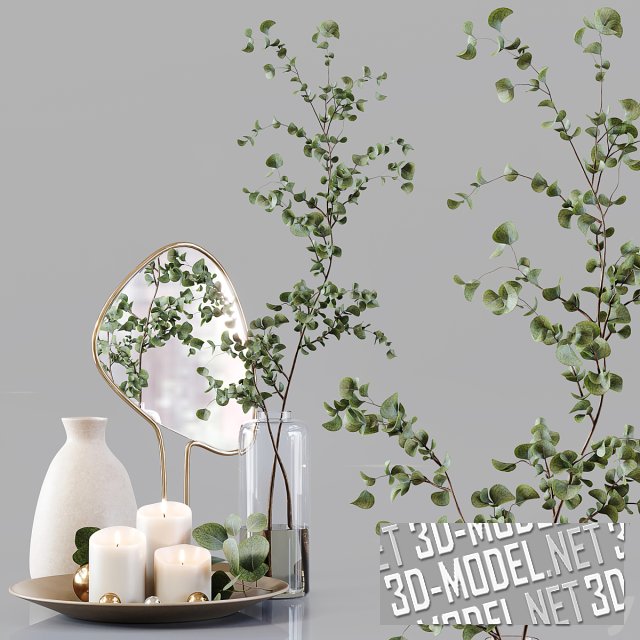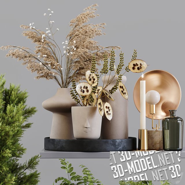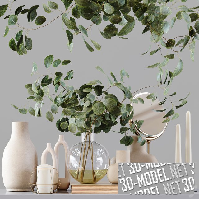 Интерьерный декор в нескольких наборах с художественной керамикой бледно-бежевого цвета, настольными зеркалами и несколькими букетами (в основном из зеленых веток) в вазах. Ветки эвкалипта, кипариса, акации, осины размещены в отдельных вазах из прозрачного и тонированного дымчатого стекла. В круглом черном подносе стоят две керамические вазочки и чашка с фрагментом стилизованного лица. В вазочке и чашке - букет из сухих метелок памапасной травы, скромная веточка гипсофилы, ветка лунарии и растения с зелеными гроздьми ягод.