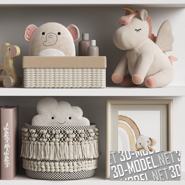 Современный набор различных аксессуров для реалистичного наполнения детской комнаты. В комплект входят: мягкие и деревянные игрушки, плетеные корзинки, картины в рамках и немалое количество книг. Все элементы образуют единую декоративную композицию и приятную атмосферу.