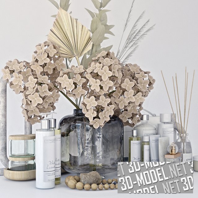 Букет из сухих соцветий гортензии, сухого стриженого пальмового листа и веточек с сухими листьями в вазе из дымчатого стекла, керамические серые вазы и средства по уходу за телом. На столе - коллекция косметических средств в баночках, тюбиках и флаконах. Несколько небольших камней, бусы из дерева и аромо-диффузор с палочками в стеклянном флаконе дополняет сцену.