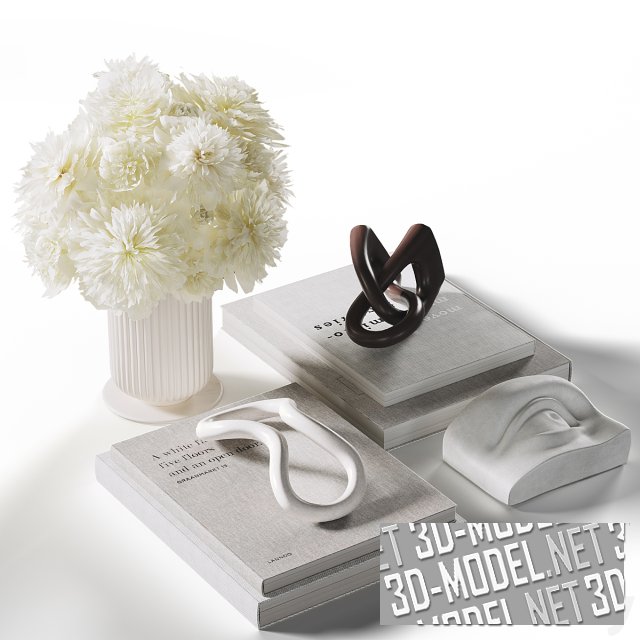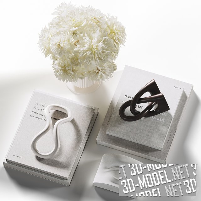 Букет белых пионов в вазе, книги в светло-серых обложках, фрагмент античной скульптуры (глаз) и абстрактные настольные фигурки (белая и черная). Круглая белая ваза в классическом стиле с гофрированной поверхностью.