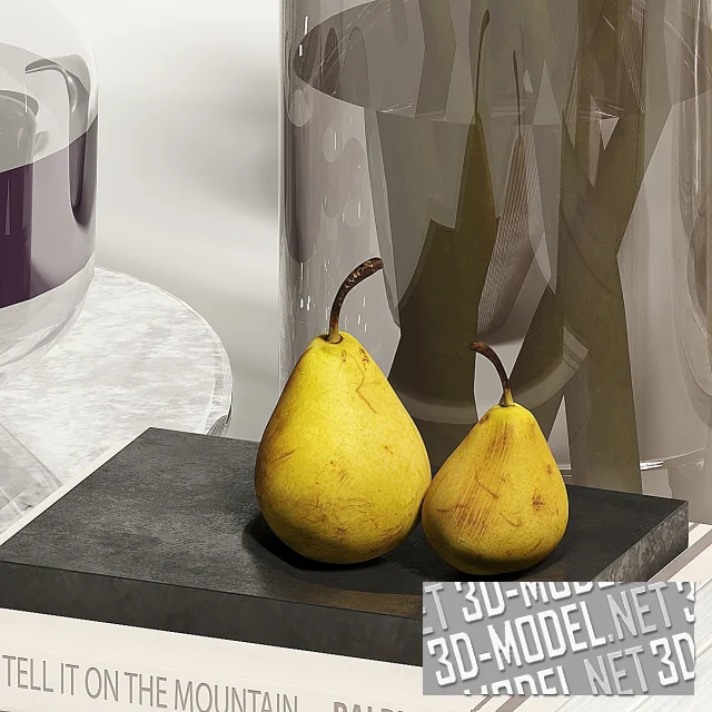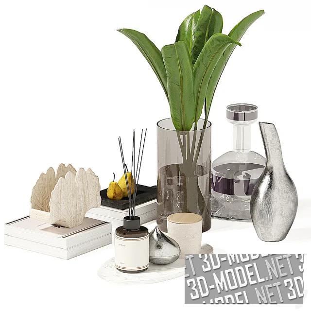 Современный комплект интерьерного декора. В наборе: букет из высоких сочно-зеленых листьев стрелиции в цилиндрической вазе из дымчатого стекла; салфетница в форме листьев гинкго билоба; аромо-диффузор, пресс-папье; серебристая металлическая ваза с узким горлышком; две желтые груши на черной прямоугольной подставке; книги; серебристая каплевидная шкатулка; свеча; овальный металлический, полированный до зеркального, поднос с парой стеклянных стаканов и графином с водой.