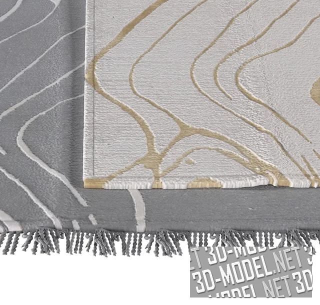 Современный ковер прямоугольной формы с зигзаобразным рисунком. В сцене представлено два варианта ковра: ковер серого цвета с небольшой бахромой по коротким сторонам и белыми зигзагами; ковер бежевого цвета с золотистым рисунком.
