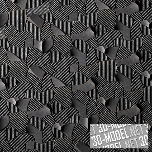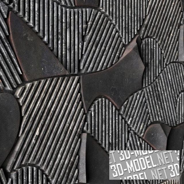Декоративное покрытие TERRE ARATE для создания настенных панно из криволинейных фигурных модульных элементов четырех типов, скомбинированых из полосок мрамора Grigio Billiemi (черно-серое рифленое заполнение фона) и скульптурных темных элементов Pietra Pece с бронзово-коричневой патиной. В массе плитка создает интересный объемный декоративный паттерн в темных тонах.
