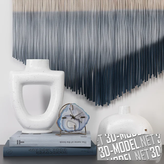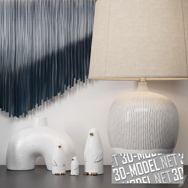 Современное настенное панно в стиле макраме и набор настольного декора. В наборе: настольный светильник (40х40х62см) с белой керамической округлой ножкой на серебристой круглой металлической площадке и белым тканевым абажуром; белые фарфоровые фигурки пингвинов; керамические белые вазы, пара книг в твердых переплетах (серо-голубого и серо-синего цвета); настольные часы с циферблатом из агата с серо-голубой текстурой. Панно на стене (габарит 90х90см) - шестиугольное, со свисающими вниз шнурами. Раскраска шнуров создает графический рисунок из пятен трех цветов: белой шерсти, серо-синий полупрозрачный и серо-синий плотный.