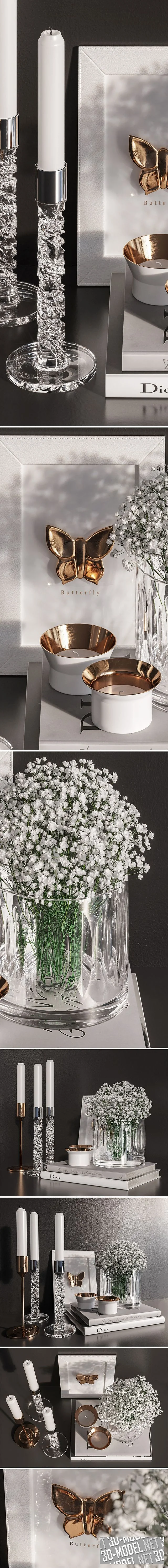 Изящный набор современного интерьерного декора. В композиции собраны пара книг в светлых обложках, два подсвечника на ножках из прозрачного материала, тонкий подсвечник из золотистого металла, белые свечи в подсвечниках, пара низких белых толстых свечей в стаканчиках (белых снаружи и золотистых внутри), белая фоторамка с объемной золотитой бабочкой на белом фоне, цилиндрическая ваза из прозрачного стекла с невысоким шариком букета из белой гипсофилы.