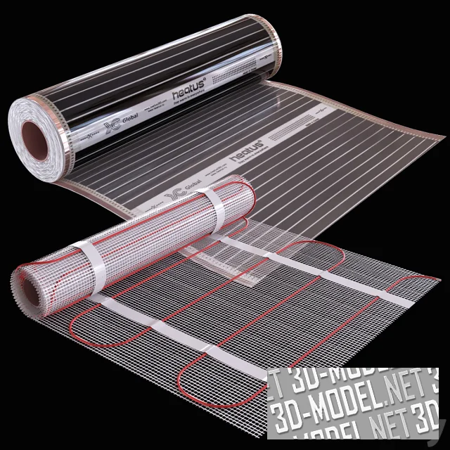 Набор оборудования (три вида рулонных матов с нагревательными элементами и контроллер) для обустройства электрических теплых полов. В рулонах предсталены два вида инфракрасных теплых полов с черными элементами из специальной пленки и вариант с низковольтным кабелем красного цвета плавной «змейкой» уложенным на белой армирующей сетке. Контроллер от Green leaf выполнен в современном дизайне, с сенсорным монитором в белом корпусе со скругленными углами.