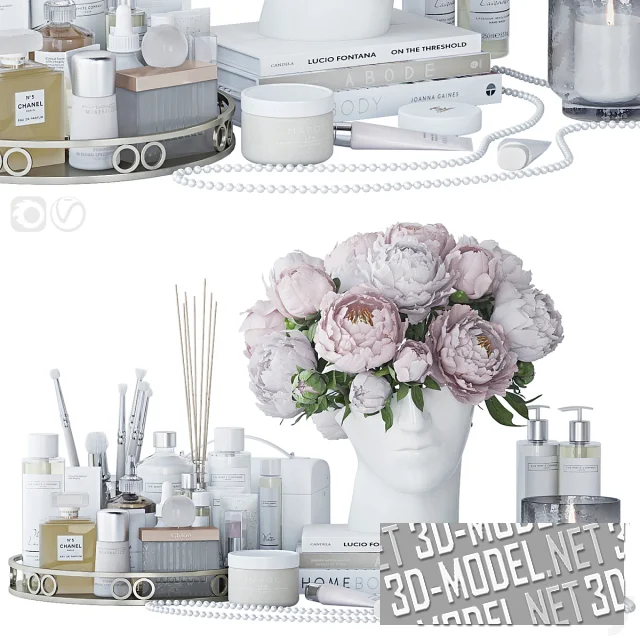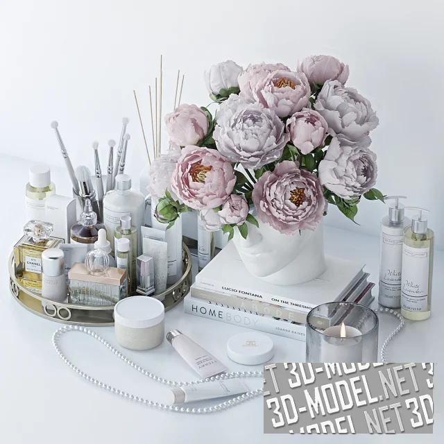 Набор интерьерного декора и косметики для размещения на дамском столике. В наборе: стопка из трех книг в твердых обложках; ваза в виде белой женской головы; букет из пышных пионов бледно-розового и бледно-сиреневого цветов; жемчужные бусы; свеча в стакане; круглый поднос; аромо-палочки; косметические кисти в стаканчике; парфюмерия и косметика от современных европейских производителей.